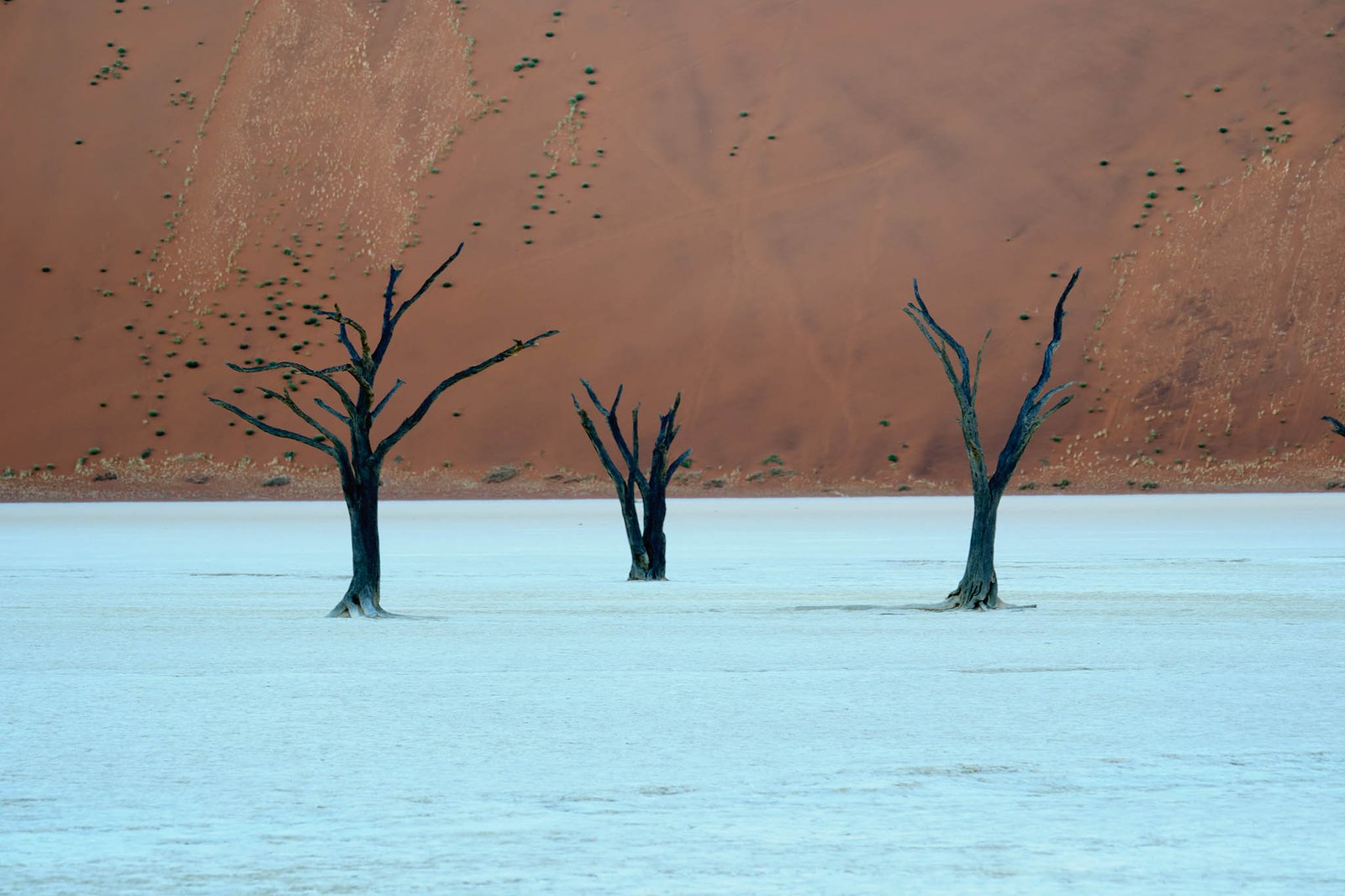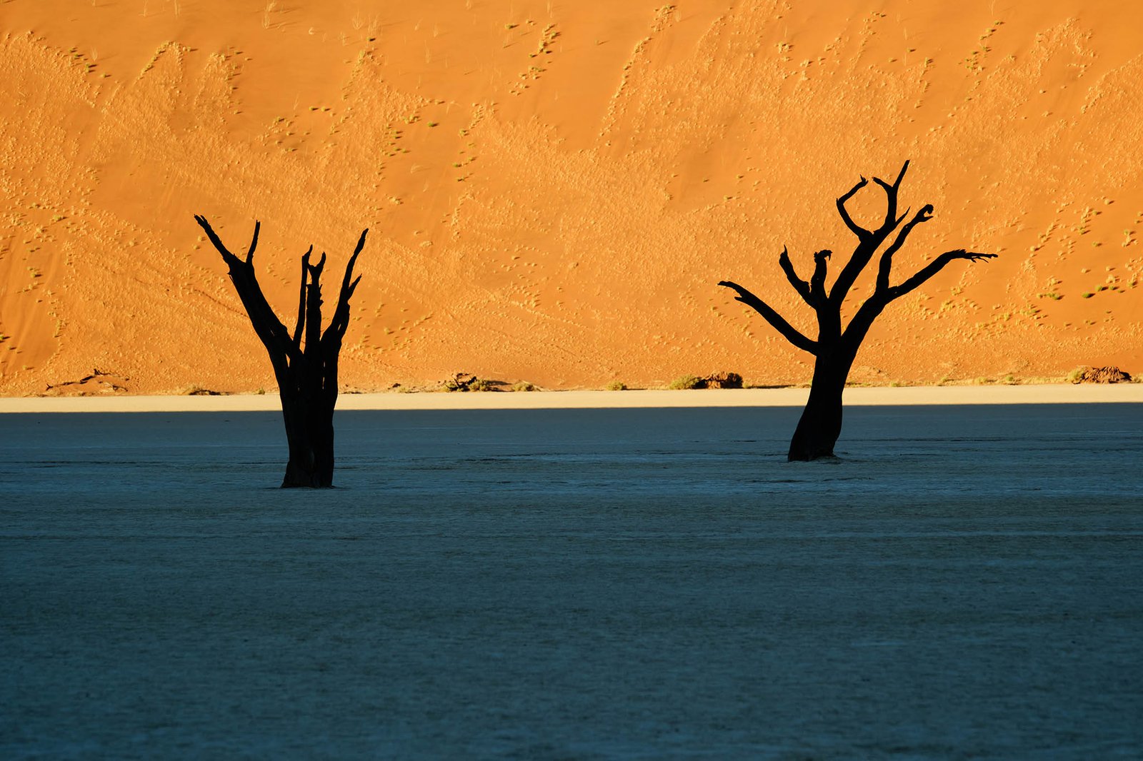 The Sossusvlei is a huge clay pan, enclosed by giant sand dunes. Some of the spectacular hills of sand are, at a height of 325 metres, the highest in the world. Only after a heavy rainfall, which is a rare event in this area, does the vlei fill with water. As the clay layers hardly allow any water infiltration, a turquoise lake will remain for quite some time. The Dead Pan is a large ghostly expanse of dried white Clay, punctuated by Skeletons of ancient camelthorn trees, about 600 years old. The dunes of the Namib Desert have developed over a period of many millions of years. It is thought that the vast quantities of sand were deposited into the Atlantic Ocean by the Orange River. This material was subsequently moved northwards by the Benguela current to be dumped back onto the land by the surf. The coastal dunes developed as a result of this and were shifted further and further inland by the wind. Wind continuously reshapes the patterns of the huge dunes of the Namib Desert. The last 5 km are only negotiable with 4×4 vehicles. Should you not have one, there are 4×4 Shuttles available if you don’t want to hike there.