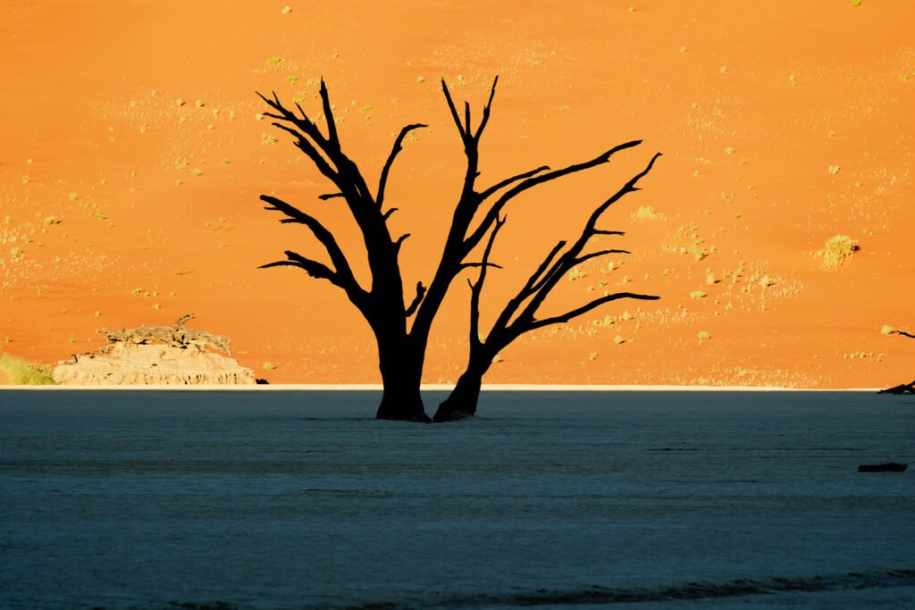The Sossusvlei is a huge clay pan, enclosed by giant sand dunes. Some of the spectacular hills of sand are, at a height of 325 metres, the highest in the world. Only after a heavy rainfall, which is a rare event in this area, does the vlei fill with water. As the clay layers hardly allow any water infiltration, a turquoise lake will remain for quite some time. The Dead Pan is a large ghostly expanse of dried white Clay, punctuated by Skeletons of ancient camelthorn trees, about 600 years old. The dunes of the Namib Desert have developed over a period of many millions of years. It is thought that the vast quantities of sand were deposited into the Atlantic Ocean by the Orange River. This material was subsequently moved northwards by the Benguela current to be dumped back onto the land by the surf. The coastal dunes developed as a result of this and were shifted further and further inland by the wind. Wind continuously reshapes the patterns of the huge dunes of the Namib Desert. The last 5 km are only negotiable with 4×4 vehicles. Should you not have one, there are 4×4 Shuttles available if you don’t want to hike there.